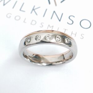 We work in all precious metals, always hallmarked in the UK and manufactured with the latest technology meaning no solder joins. We make fitted bands for unusually shaped engagement rings and and match band widths and profiles to compliment your ring.